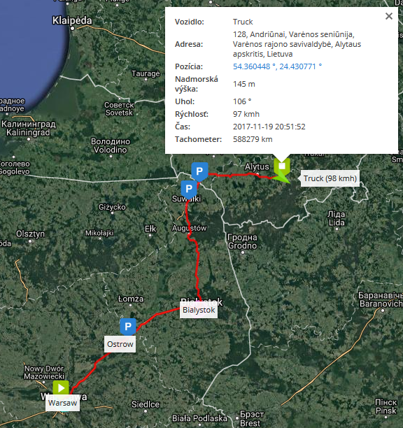 - Zobrazenie záznamu trasy (1 min až 90 dní + možnosť stiahnutia dát pre dlhodobú zálohu, archív a evidenciu a znovunahratia zálohy do systému pre ďalšiu prácu kedykoľvek)