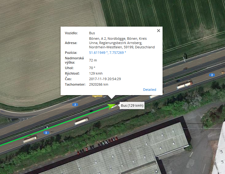 Detail náhľadu na zobrazenie záznamu prejdenej trasy po kliknutí na ikonu pozície vozidla